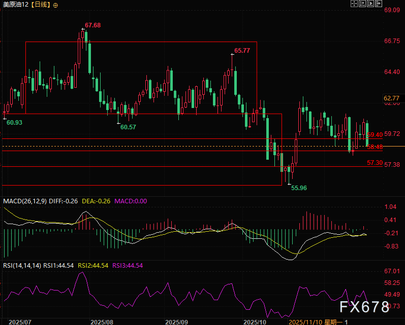 目前关键支撑依然是59.40和58.48,其中59.40已经跌破目前转换成为了压力位。
