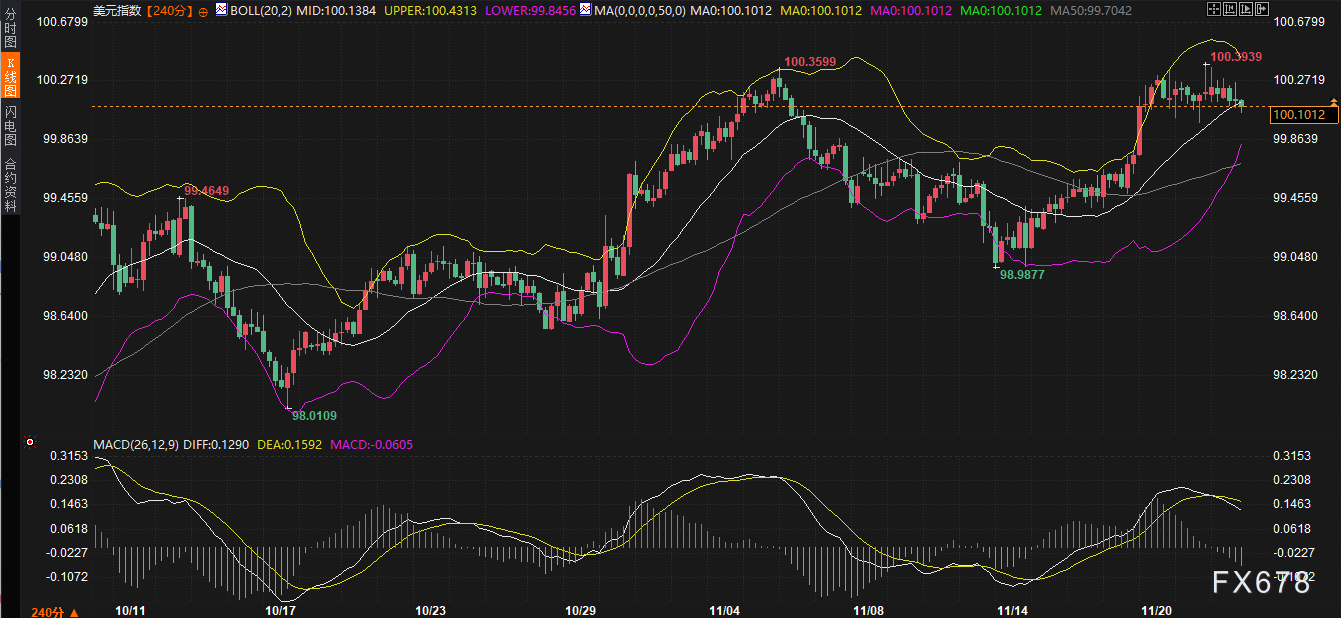 - 美元指数在100.43布林带上轨的突破意愿;