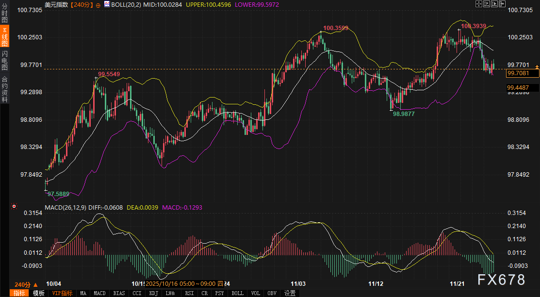 周三(11月26日)美国时段,美元指数微幅承压于99.72附近,日内跌幅0.09%,未能站稳100关口。10年期美债收益率在3.998%附近震荡,日内小幅上涨0.05%,但多次试探4%以下区间后遭遇卖压。现货黄金表现强劲,日内上涨0.77%,报4162.60美元/盎司,逼近近期高位。市场整体呈现“债市趋稳、美元疲软、黄金走强”的格局,反映出投资者在关键经济数据公布前的谨慎情绪。