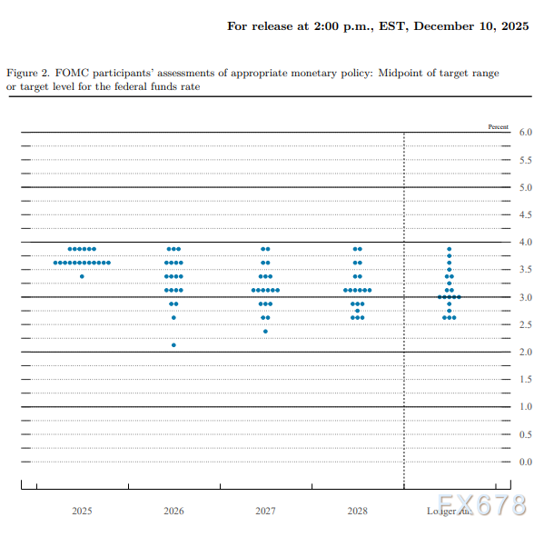 点阵图分散度仍然很高(图2)。对2026年的看法:3人想完全不降(其中有人甚至后悔今天降了),4人想维持当前3.75%,4人想再降25bp,4人想降50bp,2人想降75bp,1人想降100bp,还有1人(大概率是Miran理事)想再降150bp。我们春季前到3%(-75bp)的预测偏激进,但也不算离谱。