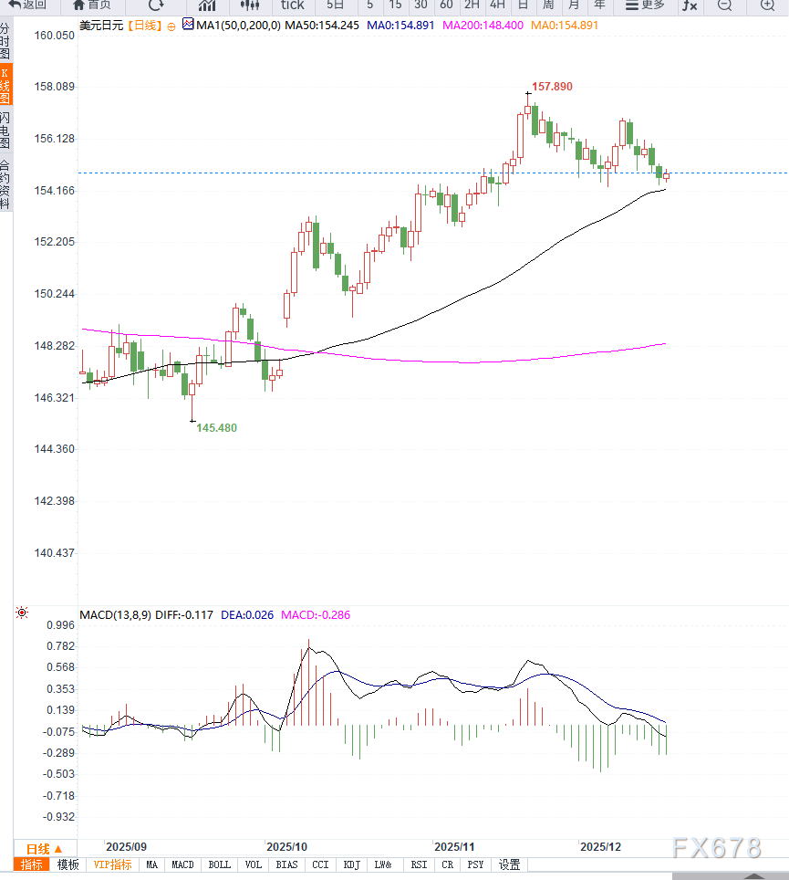 若汇价突破这一阻力位,可能触发短线多头回补行情,目标上看156.00,进一步上涨甚至有望测试月度高点157.00。
