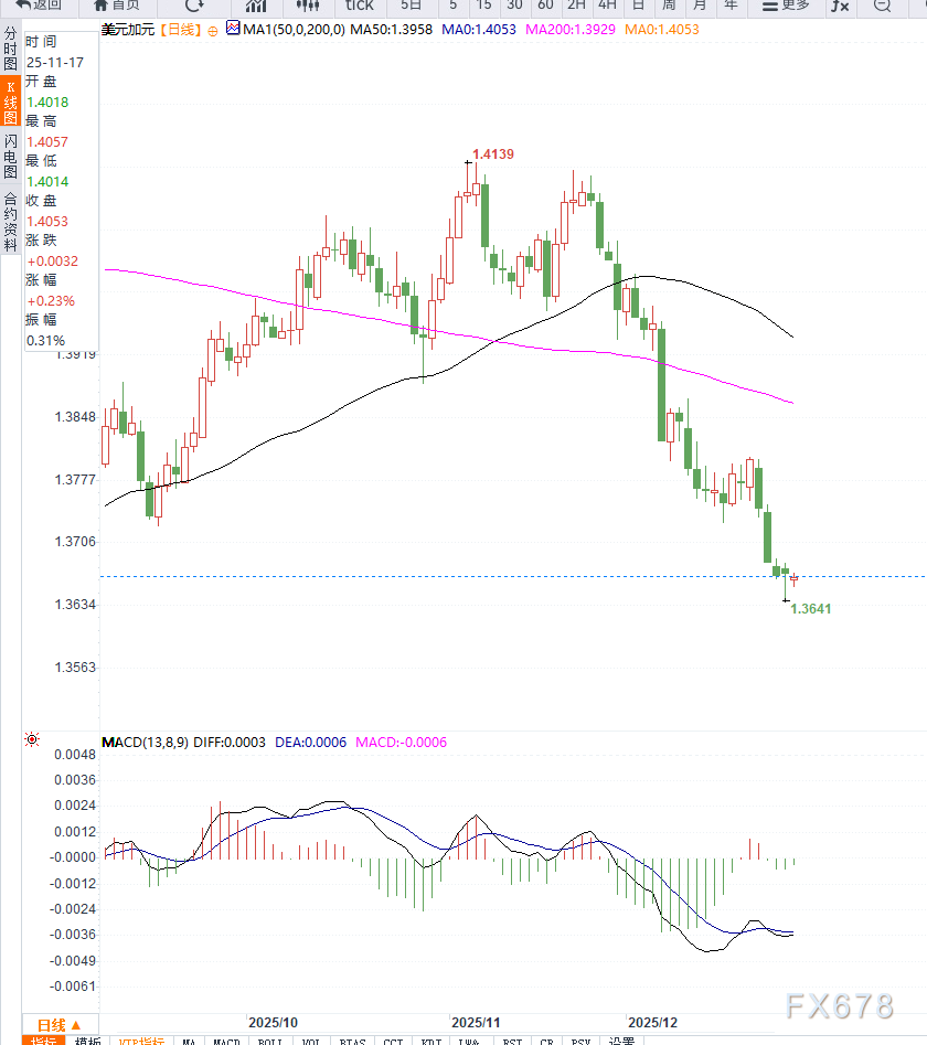 从日线走势来看,USD/CAD自11月高点持续震荡下行,整体运行于清晰的下降通道之中。当前汇价已跌破1.3700关键支撑位,并在1.3640—1.3660区间反复测试低点,显示空头趋势占据主导。