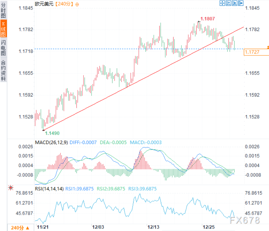 上行方面,日内早些时候汇价的上行尝试在1.1764水平受到压制。进一步上行方面,位于1.1785的反转趋势线,以及12月16日和24日位于1.1800上方的高点,预计将构成显著阻力。