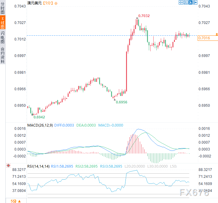 澳洲联储的鹰派转向立即波及金融市场。在11:30左右澳洲联储利率决议公布后,澳元立刻显著拉升。周二欧市时段,澳元兑美元交投于0.7020附近,日内涨幅约1.1%。